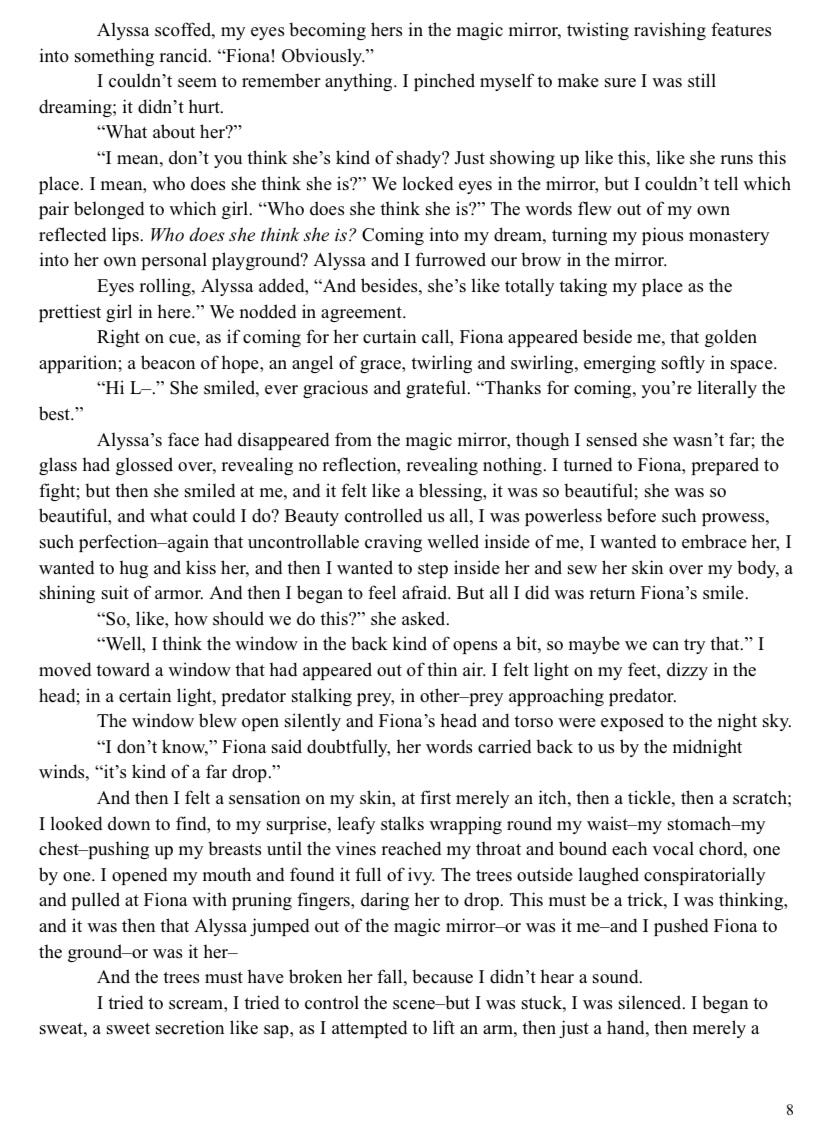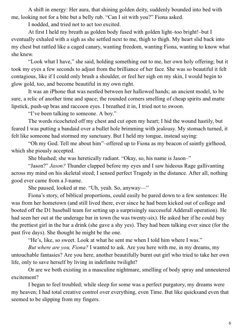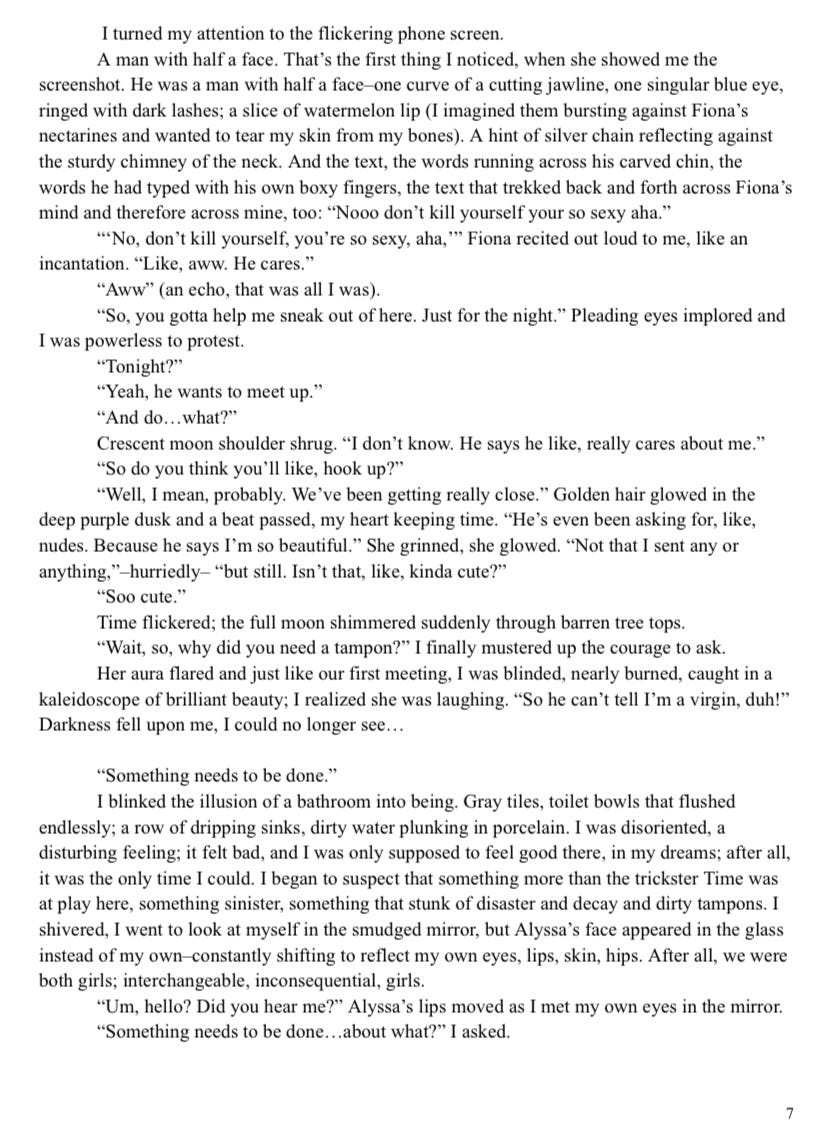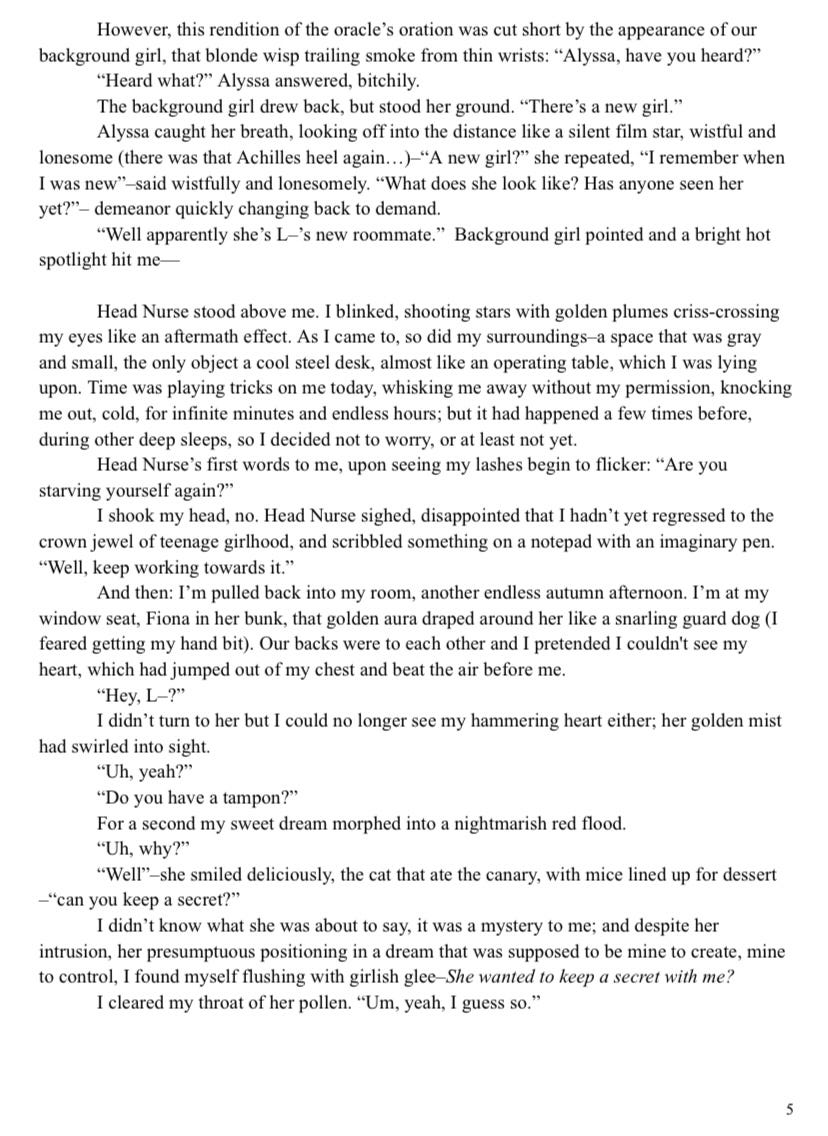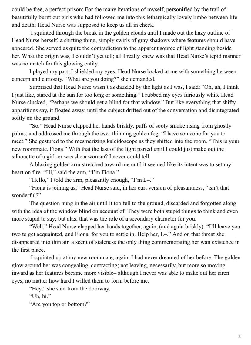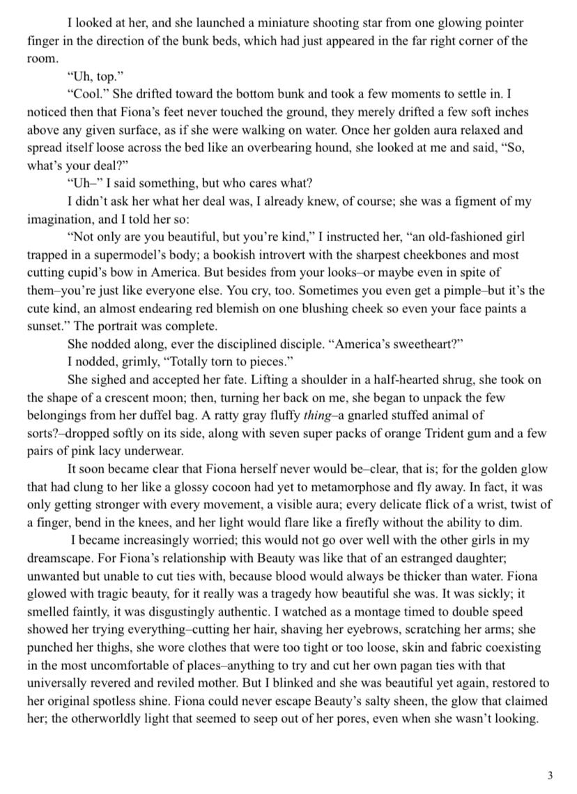 the original point of the ward, or med spa, or sanatorium, or whatever iteration i had decided on for that particular draft, was to make these girls “ugly” (whether physically or psychologically was left vague), because only then would they have the right to die. therefore, the all-encompassing Beauty was something horrifying to these girls, something to be reviled rather than revered; they wanted to get as far away from it as possible, while simultaneously being drawn back to its addicting light. fiona, the character embodying this, was therefore always part of the story; indeed, she was the central figure upon which the rest revolved.