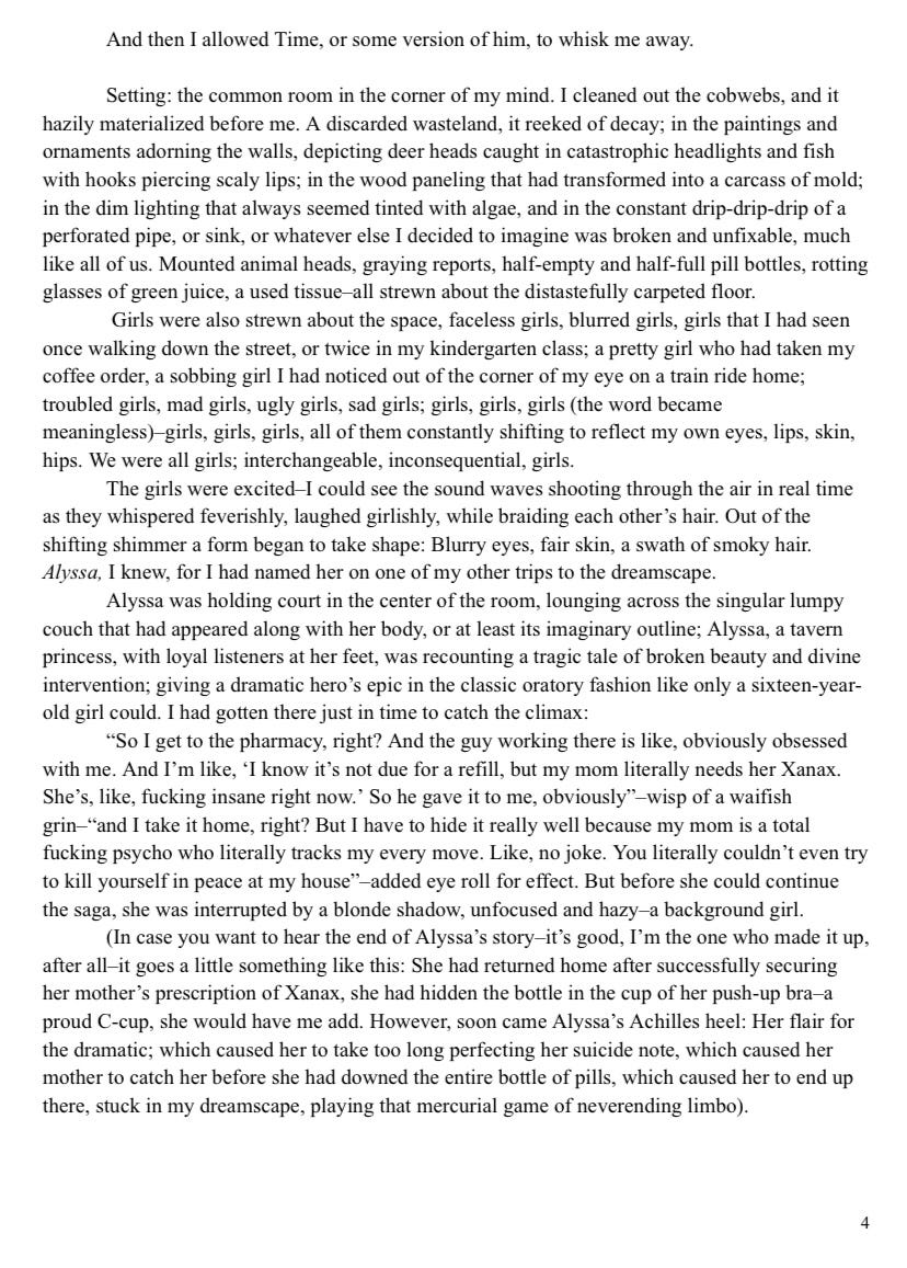and during this time i did, feel alone, that is; as my mental health reached a breaking point, it was all i could do to hold on, gripping my pen and paper like a lifeline. in march 2024 i began taking medications, which brought on a different onslaught of thoughts, feelings, and emotions, along with the most intense dreams i’ve ever had (and trust me, i’ve always been a dreamer). as i began to increase my dosages, my dreams increased in intensity; vivid nightmares becoming so out of control i became afraid to go to sleep. the main problem was this: i thought they were all real, and i was powerless (often literally, with my legs, mouth, hands, etc no longer working) to stop them.